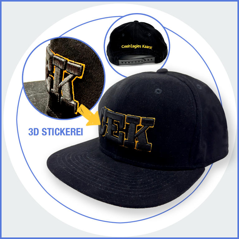Snapback Caps bestickt – Hochwertiger Merch ab 30 Stück. Individuelle Snapback Caps für Ihr Team, Ihre Fans, Ihre Marke