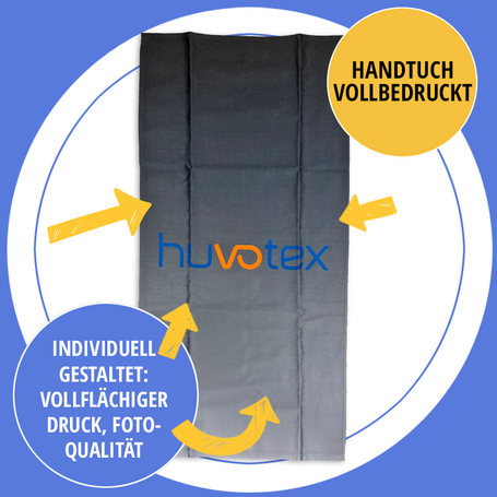 Vollbedruckte Handtücher sind auf einer Seite komplett bedruckt mit Bilder oder Grafiken, die fast Fotoqualität aufweisen und auf der anderen Seite, der weißen Rückseite, befinden sich Frotteeschlaufen zum Abtrocknen.