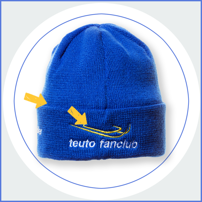 Wir fertigen individuelle Vereinsmützen gestrickt nach Ihrem Design und mit Ihrem Vereinslogo bestickt. Für Ihren Club. Für Ihre Fans. Gestrickte Vereinsmützen mit eingestricktem Motiv, einfarbig gestrickt oder als Balkenmuster in bis zu dreifarbigem Design - wir realisieren Ihre Vorstellungen. Vereinsmützen gestrickt und mit Ihrer persönlichen Logostickerei veredelt eignen sich ideal als hochwertige Vereinsartikel! Die gestrickten Vereinsmützen können auf der Stirn mit Ihrem Logo bestickt werden. Aber auch Textstickereien oder Namensstickereien sind möglich, zum Beispiel auch seitlich.
